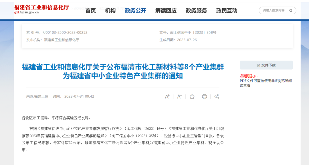 根据《福建省促进中小企业特色产业集群发展暂行办法》(闽工信规〔2022〕16号)《555电影网 关于组织推荐2023年度福建省中小企业特色产业集群的通知》(闽工信函中小〔2023〕35号),经县级中小企业主管部门申报、各设区市工信局推荐、专家评审和公示,确定了8个福建省中小企业特色产业集群。